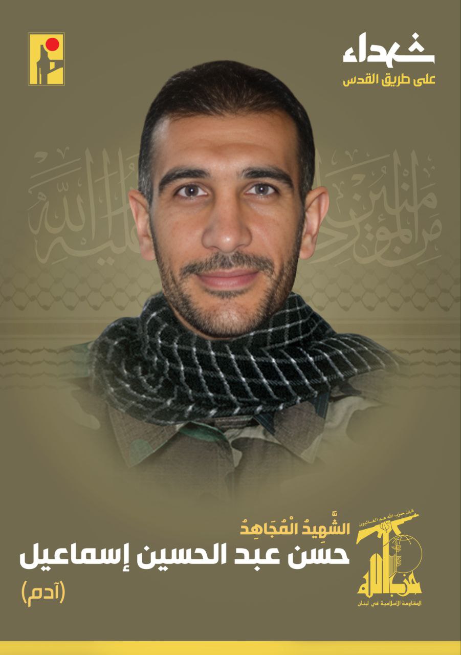 بمزيد من الفخر والإعتزاز، تزف المقاومة الإسلامية الشهيد المجاهد حسن عبد الحسين اسماعيل "آدم" من بلدة عيتا الشعب في جنوب لبنان، والذي ارتقى شهيداً على طريق القدس.