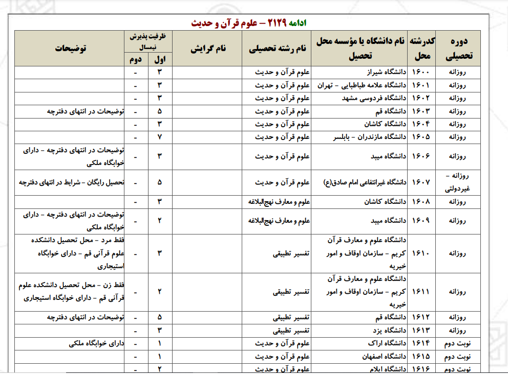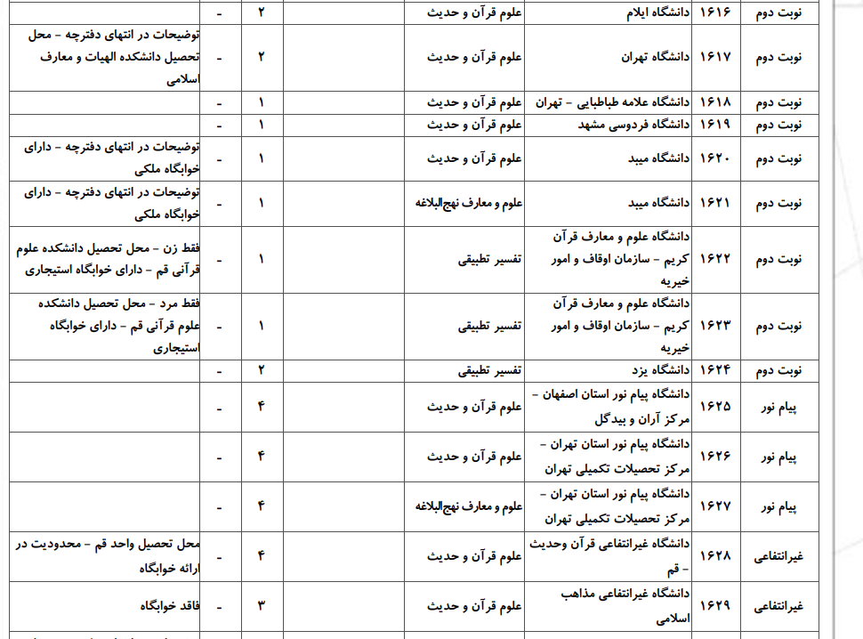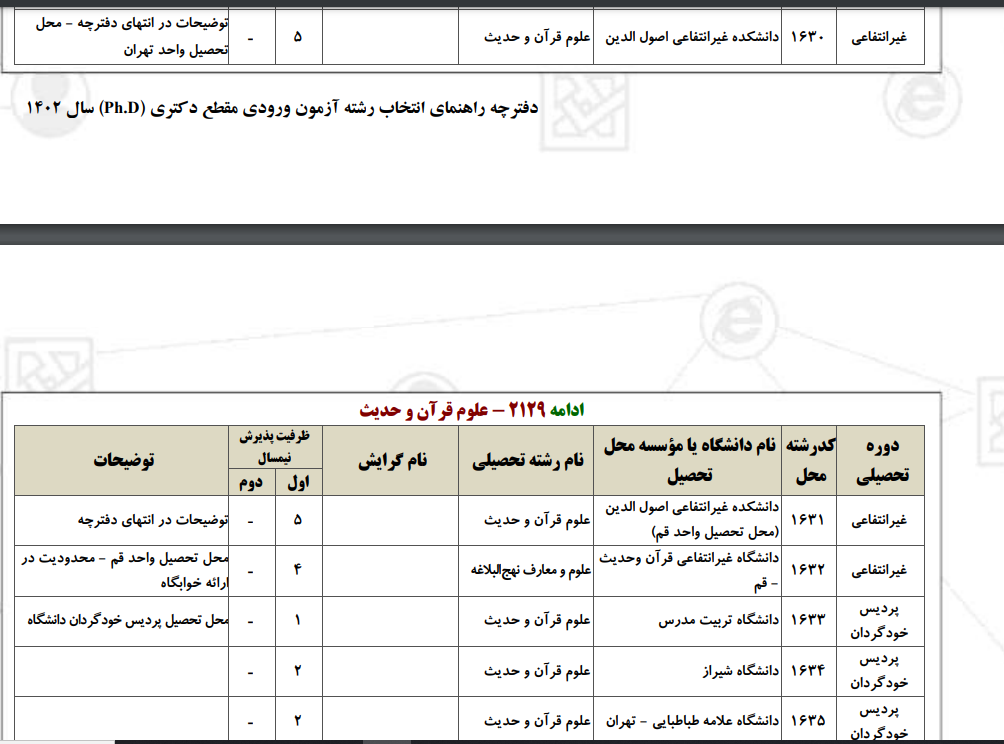 ظرفیت روزانه دولتی دکتری علوم قرآن و حدیث سال 1402