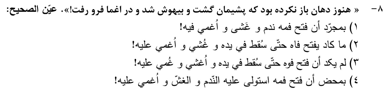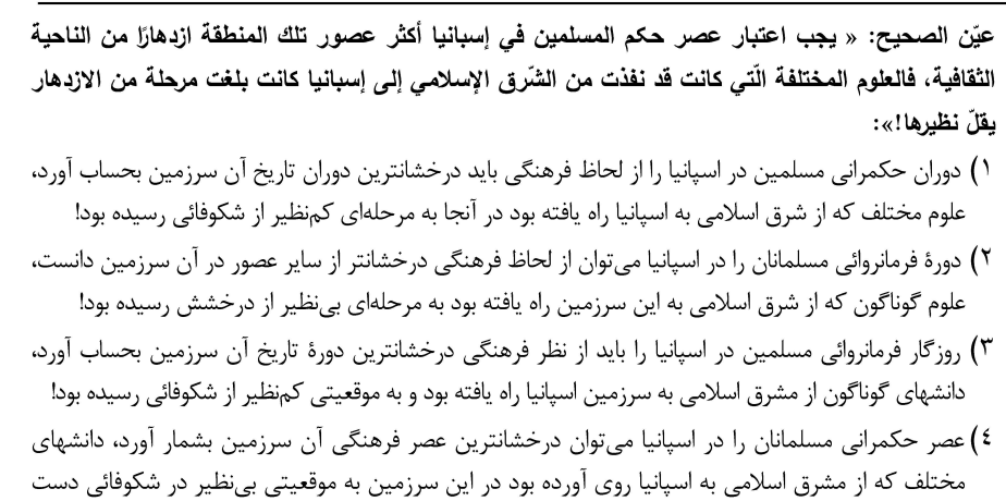 احتمال خیلی زیاد پاسخ 1 صحیح است زیرا در گزینه های 2 و 4 از می توان استفاده شده است ولی در متن عربی «یجب» آورده شده است و گزینه 3 نیز به این دلیل می تواند ناصحیح باشد که گفته شده سرزمین اسپانیا و کلمات غیرلازم را اضافه کرده است و همچنین مشرق اسلامی را به جای شرق اسلامی آورده است.