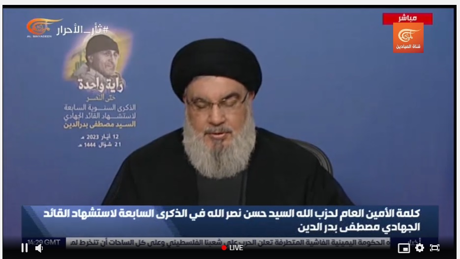 به مناسبت هفتمین سالگرد شهادت سید مصطفی بدرالدین فرمانده کل نظامی مقاومت اسلامی لبنان، دبیرکل حزبالله در حال سخنرانی هستند.