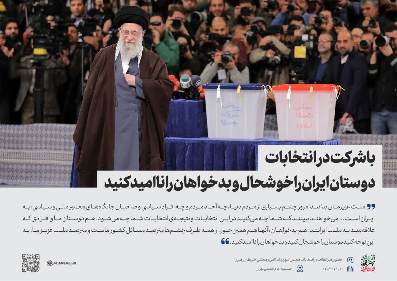 از همه شما دعوت میکنم که با شرکت فعال در انتخابات، قدرت خود را به کار بگیرید و به عنوان شهروندان مسئول، در پیوندن نظام سیاسی و تحقق آرمانهای ایرانی خویش سهمی فعال داشته باشید. بیایید با همدلی و همراهی، آینده ایران قوی را شکل دهیم و به توسعه و پیشرفت مستحکمی دست یابیم.